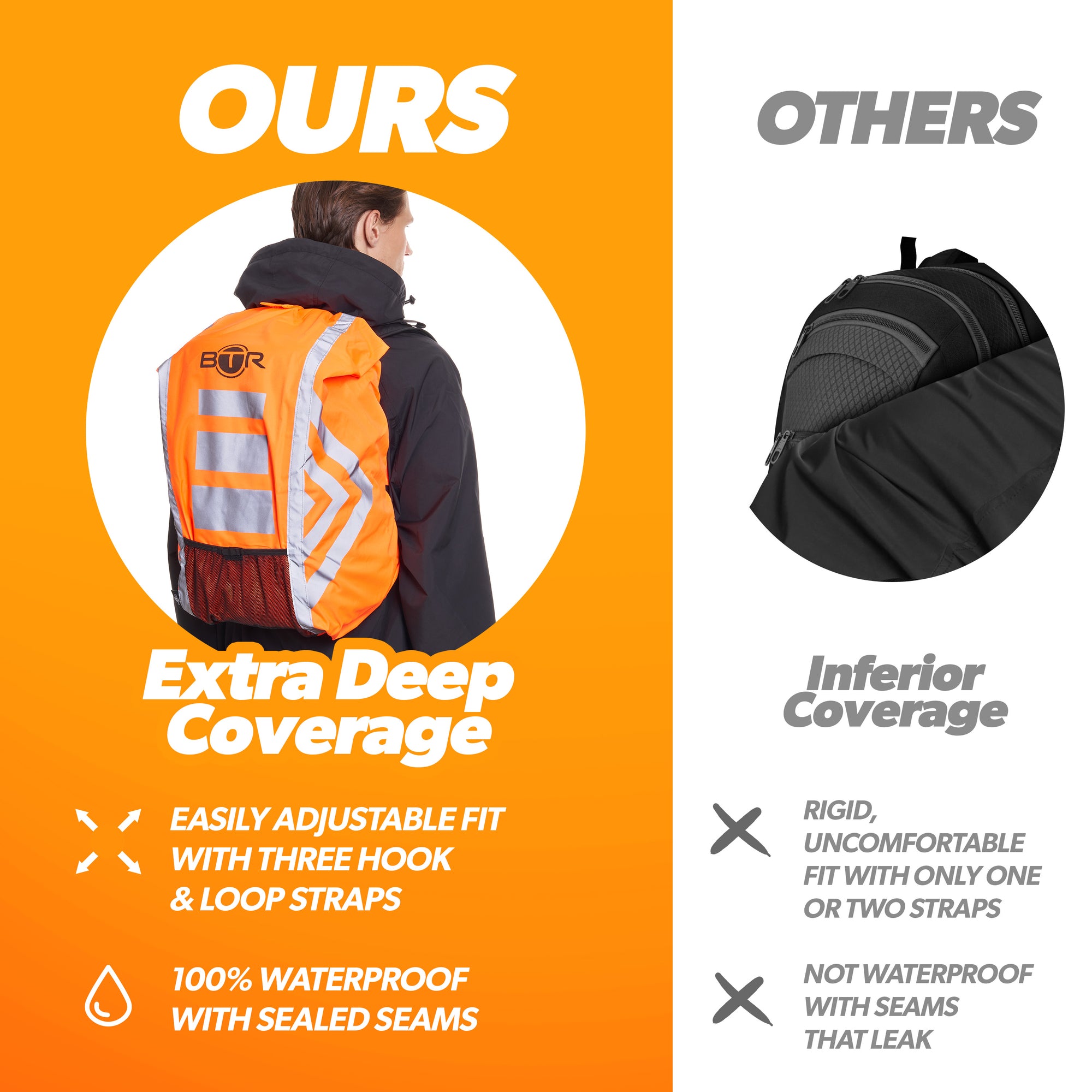 Having used similar types of backpack covers in the past which had a lot of trouble staying on, either with straps that broke or elastic round the edge that didn't really hold it, I was drawn to this with the velcro straps. After a few years of use, I've bought a replacement as the mesh pocket, where I stuffed all my cycling stuff (including bungy straps) was beginning to rip (mainly caused by bungy strap hooks getting caught in it). The rest of the cover is still in good condition. I use it to cover my backpack on the rack of my bike, and it has been very effective in keeping the rain out, even in some extreme downpours. The high-vis nature of it is also great. I would also say BTR's customer service was great in dealing in sorting things out when I ordered the wrong size. I also find that passing the vertical strap between the two horizontal straps keeps it from hanging right off if you need to get into the top of your backpack, or if the velcro at the top becomes detached.